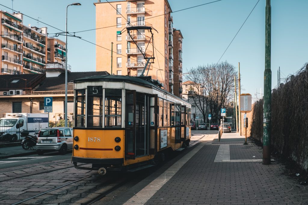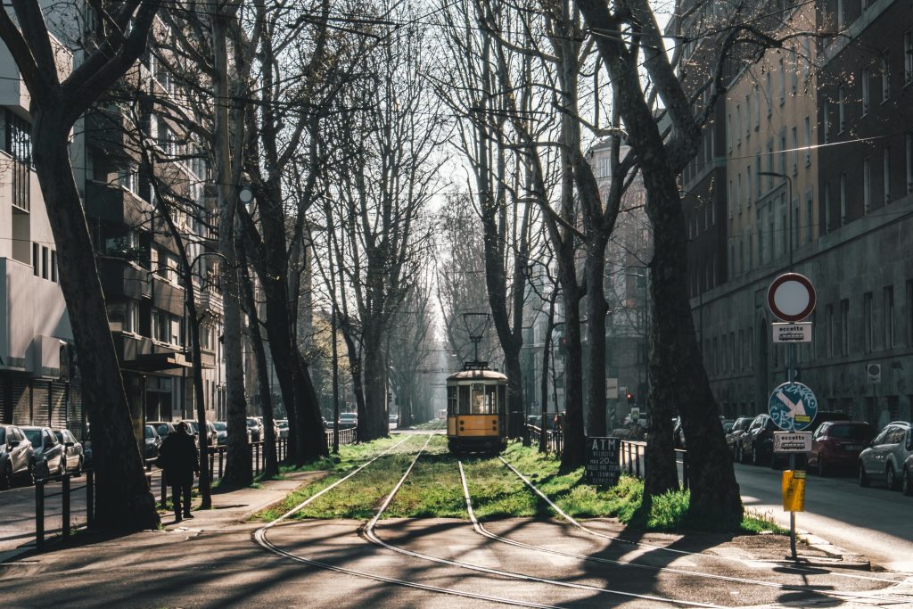 One of the historical tram line of Milan, running empty.