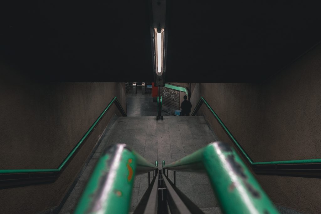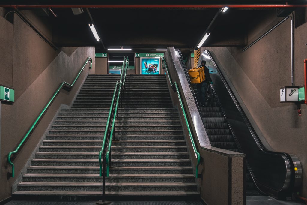 A rider of Glovo taking advantage of the empty metro line to fastly move his bike from one side to the other of the city. In order to be ready for another delivery.